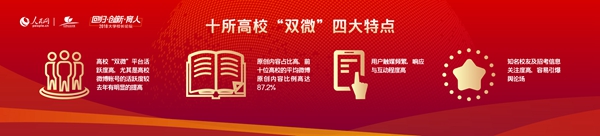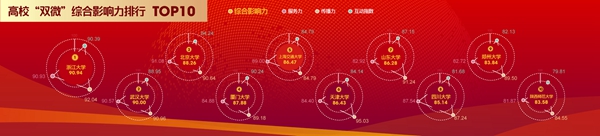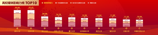 第三個榜單是高校新媒體影響力榜單。通過對高!半p微”服務力、傳播力和互動力等指標進行賦權分析,綜合評估高!半p微”等新媒體的綜合影響力,浙江大學、武漢大學、北京大學、廈門大學、上海交通大學、天津大學、山東大學、四川大學、鄭州大學和陜西師范大學的新媒體影響力位居全國高校的前十位。通過分析新媒體影響力排行前十位的“雙微”基礎數據,我們發現呈現出以下特點:一是高!半p微”平臺活躍度高;二是原創內容占比高;三是用戶觸媒頻繁,響應與互動程度高;四是知名校友及招考信息關注度高,容易引爆輿論場。