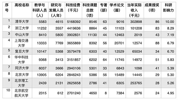 高?蒲杏绊懥ρ芯恐笜,我們根據教育部《2017年高等學?萍冀y計資料匯編》及各高校公開數據,選取了教學與科研人員、研究與發展人員、科技經費、科技課題總數、專著、學術論文、技術轉讓當年實際收入、成果授獎共八個指標。通過對八項科研因子選項的研究,清華大學、浙江大學、中山大學、上海交通大學、復旦大學、華中科技大學、同濟大學、北京大學、北京理工大學、北京航空航天大學位居全國高?蒲杏绊懥η笆。