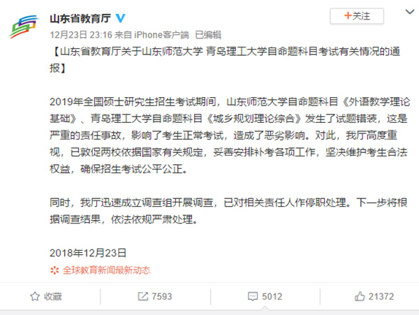 山東省教育廳官方微博發布消息回應稱,2019年全國碩士研究生招生考試期間,山東師范大學自命題科目《外語教學理論基礎》、青島理工大學自命題科目《城鄉規劃理論綜合》發生了試題錯裝,這是嚴重的責任事故,影響了考生正?荚,造成了惡劣影響。