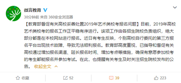 教育部回應藝考報名平臺出現故障:已督促有關高校妥善處置