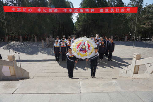 大家懷著無比崇敬的心情來到盤山烈士陵園。站在英雄紀念碑前,全體立正,奏唱國歌,在雄壯的國歌聲中,平谷職校盤山烈士陵園謁陵儀式正式開始了。首先,團員代表向革命烈士紀念碑敬獻花圈,全體師生默哀一分鐘,緬懷先烈,寄托哀思。