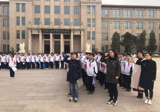 初一年級師生到達中國人民革命軍事博物館,在軍博前廣場舉行以“讓奮斗青春托起新時代強軍夢”為主題的初一年級向國旗宣誓愛國主義教育活動。學生代表首先進行詩朗誦《我和我的祖國》,在激昂的朗誦中,師生濃濃的情感涌動,由衷地自豪升騰,一同感受七十年來新時代下祖國的偉大變遷與繁榮強盛。隨后,全體師生面向國旗集體宣誓。每一位同學鏗鏘嘹亮宣誓聲,堅定不移初心夢,立志把青春的豪邁和錚錚的誓言,化作務實的行動,勤學奮進、腳踏實地,用良好的習慣和優秀的品格為祖國奉獻青春、智慧和力量。