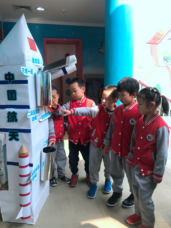小朋友們在開學典禮上了解了祖國的偉大成就,激發了他們探索的欲望。他們與家長一起收集各種資料,認識了更生動、更具體、更真實的科技成果。比如非常宏偉的港珠澳大橋是連接香港、珠海、澳門的超大型跨海大橋,全長55公里,是最長的跨海大橋!疤炜斩枴睂嶒炚臼侵袊谝粋真正意義上的空間實驗站等等。孩子們在拼插區和美工區制作了這些科技成果作品,然后在樓道中進行展示,有磁懸浮列車、高鐵、智能機器人、中國航母等等,最后孩子們制作出了天宮系列、神州系列、火箭系列等飛行器。