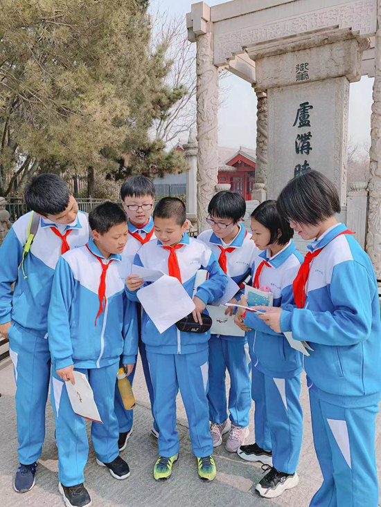 走出抗日戰爭紀念館,同學們又來到盧溝橋上。各班按“盧溝歷史”、“盧溝曉月” 、“橋文化”、“小品建筑”等主題分為小組,一邊看著兩側欄桿的石獅子,驚嘆于先人的雕工精巧,獨具匠心,一邊又感慨于這些石獅曾經經歷過當年戰火的洗禮,曾目睹了革命先輩用自己的血肉之軀捍衛民族尊嚴。一獅一石,一碑一路,無不令同學們深深意識到今天幸福生活的不易。