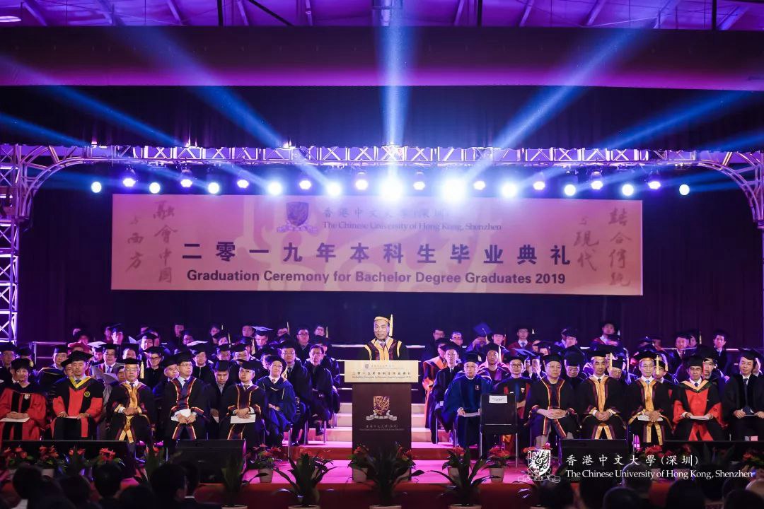 今次是我校第二屆本科生的畢業典禮,也是我校理工學院首屆本科生的畢業典禮,因此具有特別的意義。自2014年大學成立以來,我們已走過了五個年頭,在這五年中,我們從無到有,從弱小到壯大,取得了很多的進展與成績,今年我們成立了第四個學院“生命與健康科學學院”,“醫學院”和“音樂學院”的籌備工作也已逐漸展開,大學正朝著創建一所世界一流的研究型大學的目標在努力邁進,這些都離不開我們的師生、家長以及社會各界朋友的共同努力,也離不開深港兩地政府和香港中文大學的幫助與支持,在這個收獲的時刻,我要感謝每一位幫助和支持過我們的朋友,我特別高興大家今天能夠共聚一堂,見證這個榮耀和歡慶的時刻。