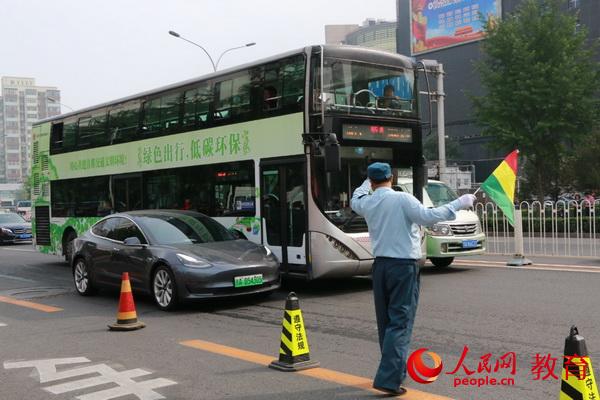 7日上午,安保人員指揮車輛繞行考點 盧靜/攝
