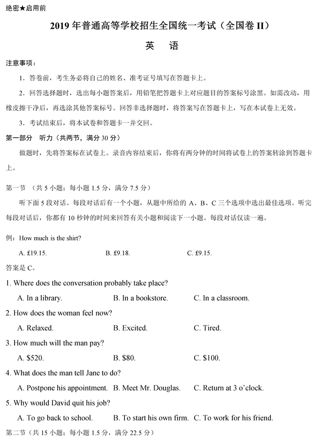 2019年全國卷Ⅱ英語高考試題