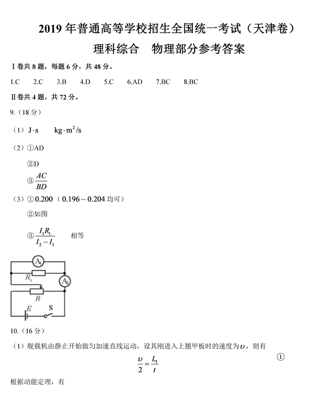 2019年天津卷理綜高考試題答案