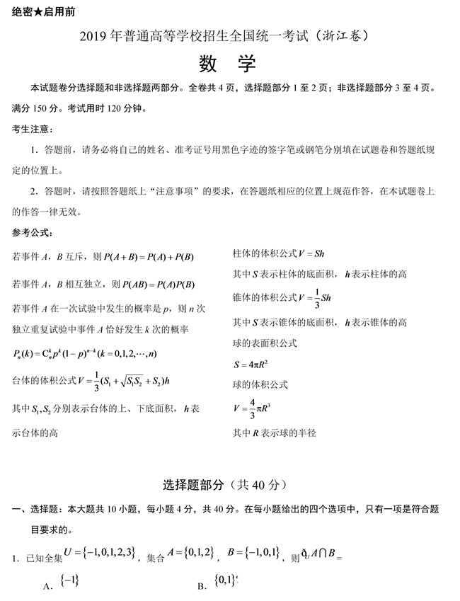 2019年浙江卷數學高考試題