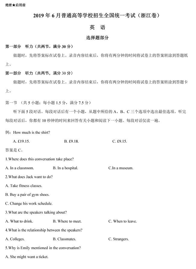 2019年浙江卷英語高考試題