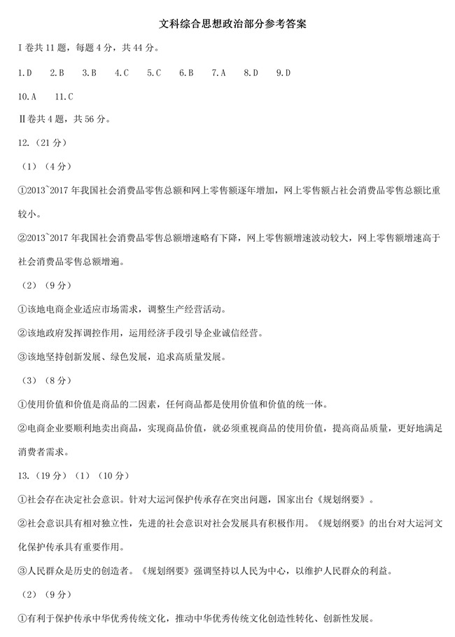 2019年天津卷文綜高考試題答案