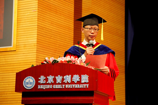 同學們,你們在校時間雖然不長,卻是結下了一世學緣。如此優秀的你們就要走出校門,踏入社會了。這是一次遠行,在不遠的前方等待你們的,是閃閃發亮的理想、未來與榮光。作為校長,我希望你們以李書福董事長為榜樣,發揚李書福董事長“勇擔時代使命、勇于拼搏進取、勇于挑戰困難、勇于創新發展”的愛國奮斗精神,為國家發展、為民族振興奉獻青春力量。在你們即將開啟人生新征程的時刻,有幾句話與同學們共勉。
