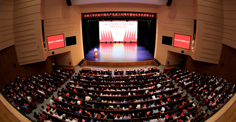 吉林大學黨員干部代表共同慶祝中國共產黨成立98周年,大會現場對全校優秀共產黨員、優秀黨務工作者和先進基層黨組織及黃大年精神宣講先進集體和個人進行了表彰。全體參會校領導和黨員干部重溫入黨誓詞,高唱國際歌。
