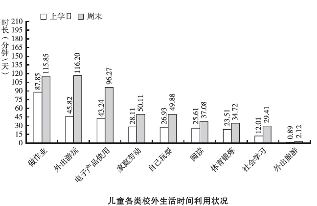 報告顯示,在上學日,平均每個兒童的校外生活時間分配中,花費時間最多的類別是做作業(包括學校作業、課外班作業、家長布置的作業、其它作業),占時87.85分鐘。在周末,占據兒童校外生活時間最多的事項是外出游玩,占時116.20分鐘。在假期,78.70%的兒童有暑假走親訪友的經歷,62%的兒童有外出旅游的經歷。