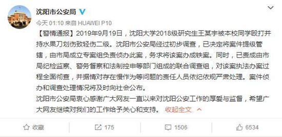 遼寧省沈陽市公安局官方微博19日發布警情通報稱,2019年9月19日,沈陽大學2018級研究生王某宇被本校同學毆打并持水果刀劃傷致輕傷二級。沈陽市公安局經過初步調查,已決定將案件提級管轄,由市局成立專案組負責偵辦此案,務求將該案辦成鐵案。