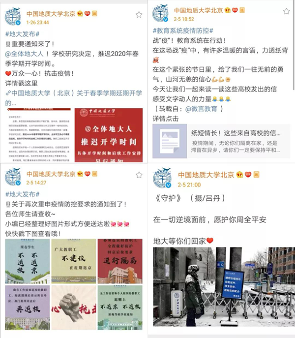 制作推送《地大人,行動起來!從我做起,科學防護!》引導師生科學做好防護,最大程度減少感染風險,制作防控宣言“九宮格”圖,生動直觀的講解疫情防控注意事項,《共同戰“疫”,地大人在行動》深入報道防控一線的工作成效,《憑君傳語報平安,湖北的同學來啦!》搭建起學校與湖北師生之間的溝通橋梁;落實意識形態工作責任,發揮導師、輔導員、班主任等育人隊伍作用,借助線上平臺強化師生思想引導與人文關懷,鼓勵學生“線上”學習。