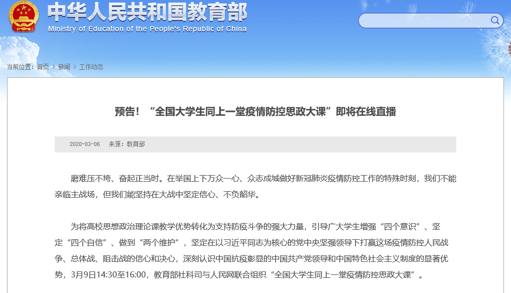 人民網北京3月6日電 (孫競)教育部官方網站今天發布“全國大學生同上一堂疫情防控思政大課”即將在線直播預告:3月9日14:30至16:00,教育部社會科學司與人民網聯合組織“全國大學生同上一堂疫情防控思政大課”,歡迎關注。