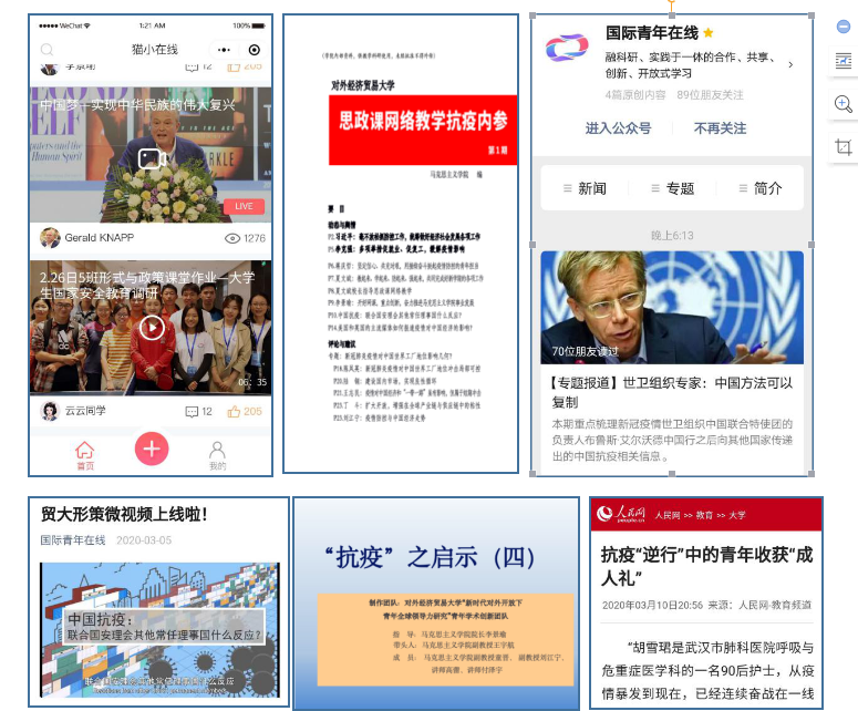 為推進思政課教學的改革創新,對外經貿大學馬克思主義學院抓住契機,積極創制網絡授課教學資源,創新云端授課形式,不斷提升思政課的針對性和學生獲得感。學院將在網絡教學期間持續開展抗疫專題實踐教學工作,以青年參與國際交往為方向,講好貢獻中國智慧和方案。