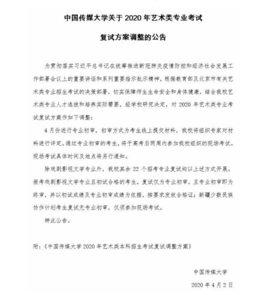 附:《中國傳媒大學2020年藝術類本科招生考試復試調整方案》
