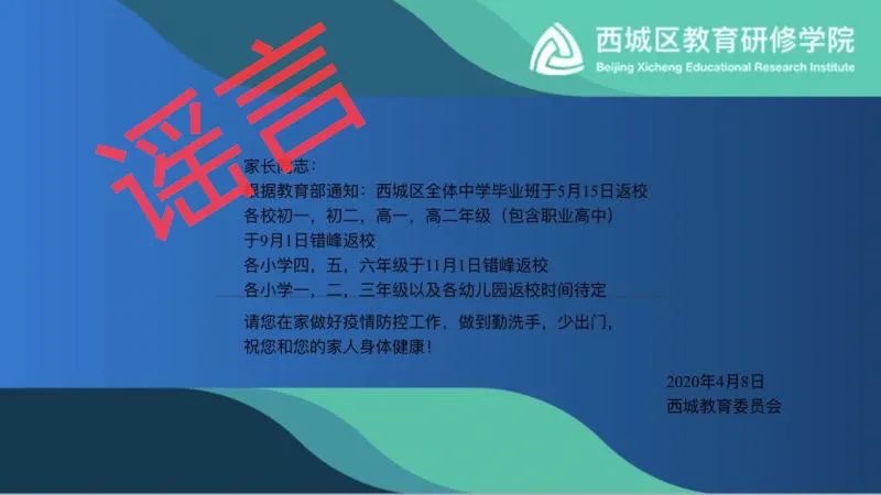 人民網北京4月8日電(李依環)據北京市西城區教育委員會消息,近日,部分家長微信群流傳“西城區全體中學畢業班于5月15日返!钡认。對此,北京市西城區委教育工委、區教委明確表示,這是一條虛假信息。
