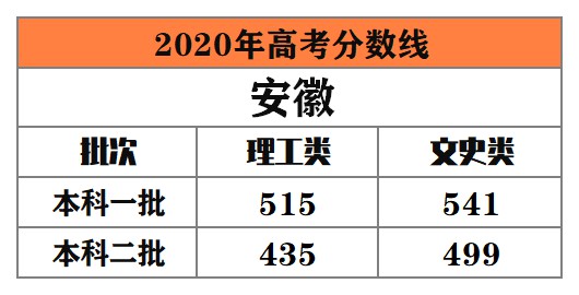 安徽 本科一批:理工類515分。文史類541分;本科二批:理工類435分,文史類499分。