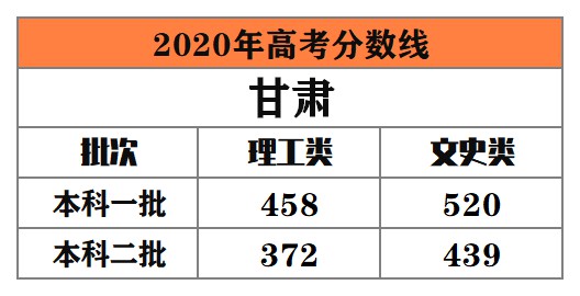 甘肅 本科一批:理工類458分,文史類520分;本科二批:理工類372分,文史類439分。
