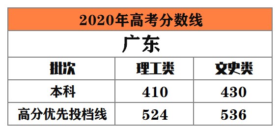 廣東 本科最低控制線:理工類410分;文史類430分;高分優先投檔線:理工類524分,文史類536分。
