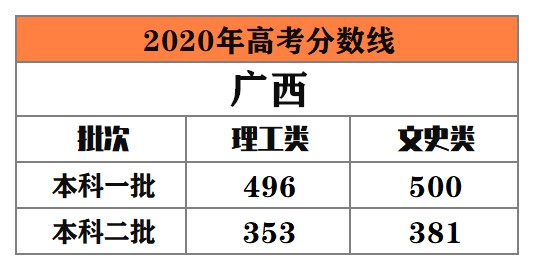 廣西 本科一批:理工類496分,文史類500分;本科二批:理工類353分,文史類381分。