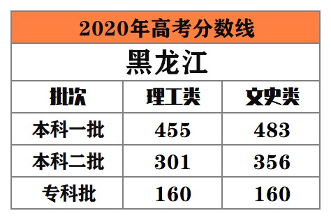 黑龍江 本科一批:理工類455分,文史類483分;本科二批:理工類301分,文史類356分。