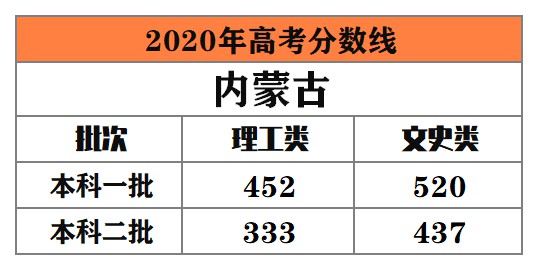 內蒙古 本科一批:理工類452分,文史類520分;本科二批:理工類333分,文史類437分。