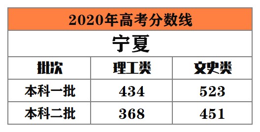 寧夏 本科一批:理工類434分,文史類523分;本科二批:理工類368分,文史類451分。