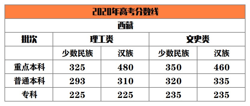 西藏 重點本科:理工類325分(少數民族)、480分(漢族),文史類350分(少數民族)、460分(漢族);