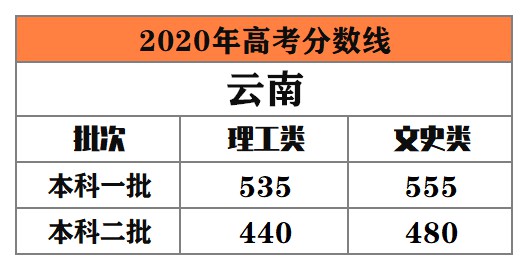 云南 本科一批:理工類535分,文史類555分;本科二批:理工類440分,文史類480分。
