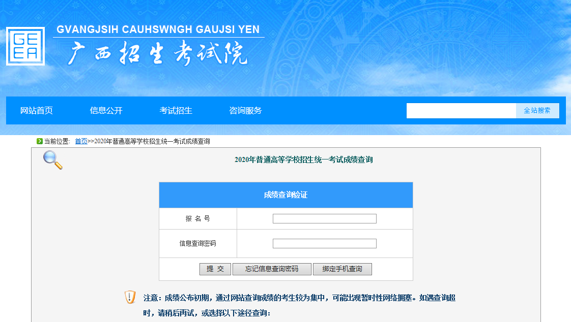 人民網北京7月24日電 (記者 郝孟佳)據廣西招生考試院消息,廣西壯族自治區2020年普通高考成績查詢系統開通,考生須通過高考報名號和信息查詢密碼登錄“成績查詢系統”,信息查詢密碼的初始密碼為高考報名系統登錄密碼。