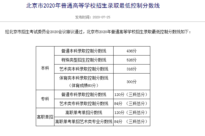 2020北京高考分數線發布:普通本科錄取控制分數線436分