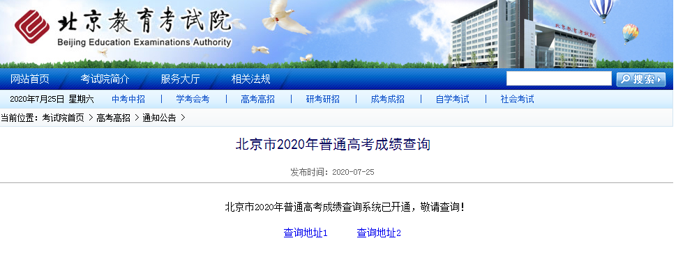 人民網北京7月25日電 2020年北京高考成績查詢系統開通,考生可登陸北京教育考試院進行查詢。