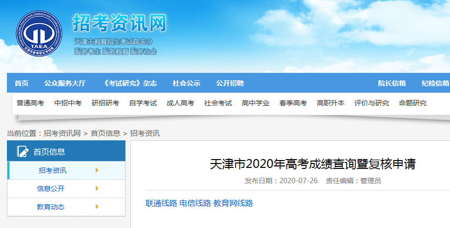人民網北京7月26日電 2020年天津市高考成績查詢系統開通,考生可登陸天津市教育考試院進行查詢。