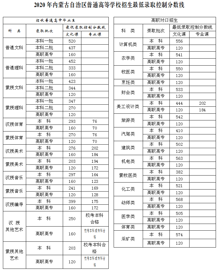 人民網北京7月27日電 據內蒙古招生考試信息網消息,2020年內蒙古自治區普通高等學校招生最低錄取控制分數線劃定,普通文科一本520分 理科一本452分。