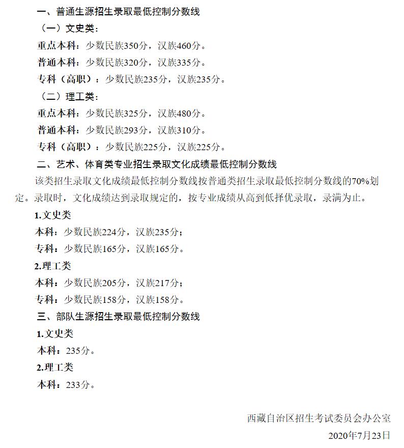 2020西藏高考分數線發布:重本文史類少數民族350、漢族460