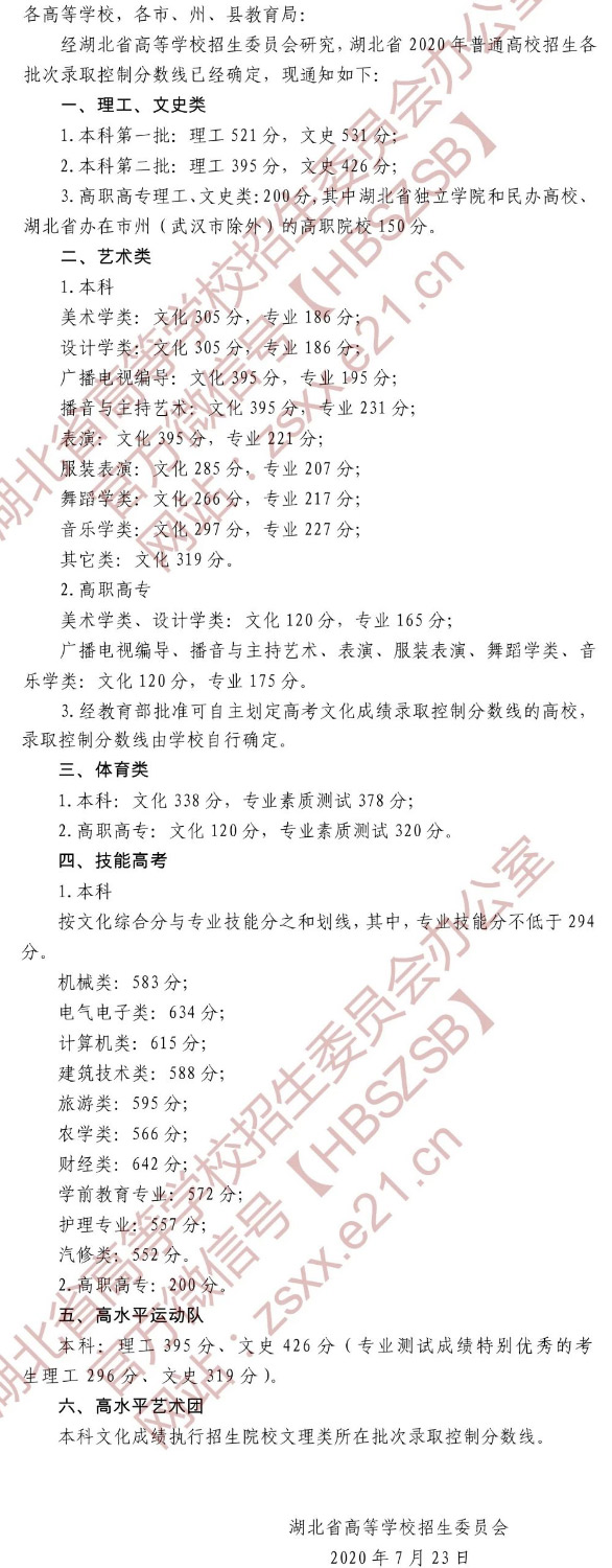 人民網北京7月27日電 據湖北教育考試網消息,2020年普通高校招生錄取控制分數線劃定,文史一本531分 理史一本521分。
