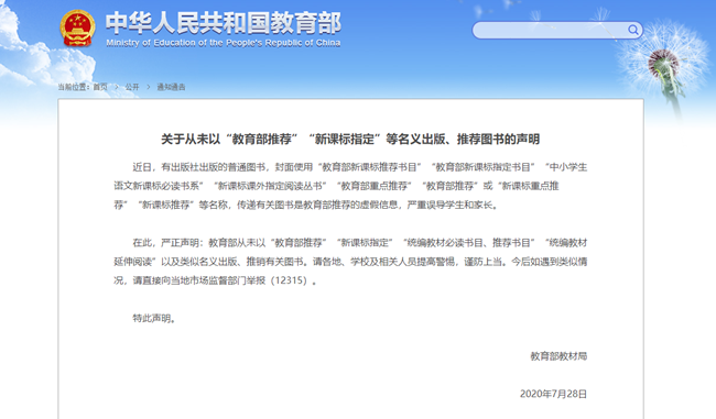為此,教育發布嚴正聲明:教育部從未以“教育部推薦”“新課標指定”“統編教材必讀書目、推薦書目”“統編教材延伸閱讀”以及類似名義出版、推銷有關圖書。請各地、學校及相關人員提高警惕,謹防上當。今后如遇到類似情況,請直接向當地市場監督部門舉報(12315)。
