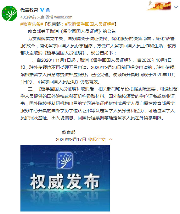 人民網北京9月17日電 (記者 郝孟佳)據教育部官方微博消息,為貫徹落實黨中央、國務院關于減證便民、優化服務的決策部署,深化“放管服”改革,簡化留學回國人員辦事程序,方便廣大留學回國人員工作和生活,教育部決定取消《留學回國人員證明》。