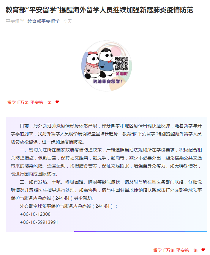 人民網北京9月28日電 (記者 郝孟佳)今天,教育部留學服務中心通過微信公眾號“平安留學”提醒海外留學人員繼續加強新冠肺炎疫情防范。