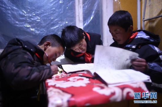 3月16日,在索加鄉寄宿小學,羅松東。ㄖ校┖托』锇樵谒奚醿葴亓暪φn。新華社記者 張宏祥 攝