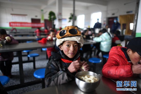 3月16日,在索加鄉寄宿小學食堂,格來達杰(前)在吃晚餐。新華社記者 韓方方 攝