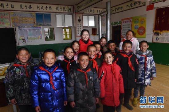 3月16日,在索加鄉寄宿小學,卓瑪才吉老師(后排中)和學生在一起。新華社記者 張宏祥 攝