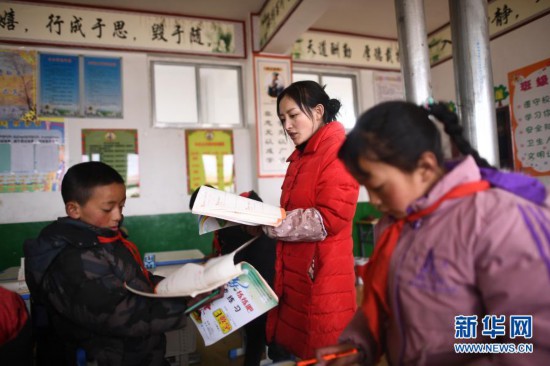 3月16日,索加鄉寄宿小學數學老師卓瑪才吉(左二)在課后輔導學生功課。新華社記者 駱曉飛 攝