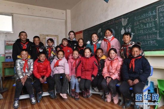 3月16日,在索加鄉寄宿小學,查日老師(后排中)和學生在一起。新華社記者 駱曉飛 攝