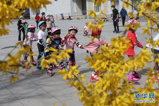 3月30日,小朋友們在中國兒童中心上室外輪滑課。