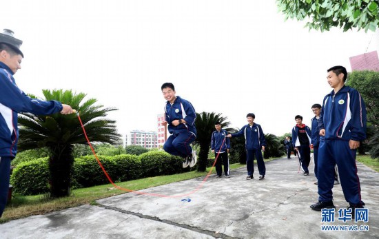 5月18日,湖南省資興市立中學的高三學生在玩跳繩游戲。